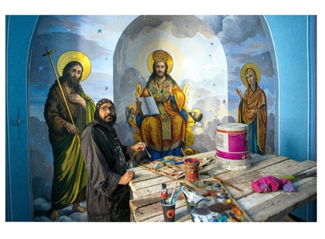 For others, this language is iconographic. After exploring other paths, Theophilus Al-Orshlemy from Egypt gradually realized that art was his true calling, eventually becoming an iconographer and restorer for the Coptic Orthodox Church of Egypt and now of Jerusalem. “Art is a story. Icons tell stories,” he says, explaining how icons engage the whole person: “My eyes move because the icon is telling me a story… When all the senses are involved, the space becomes oriented toward God rather than distraction.”
