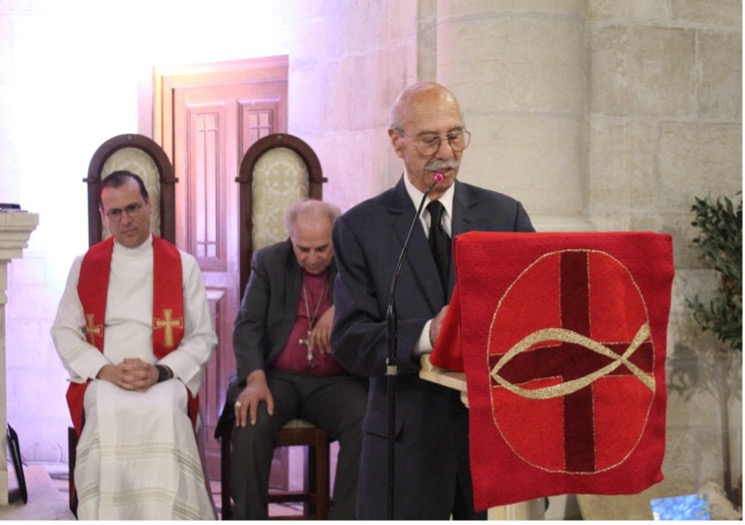 A Palestinian artist based in Bethlehem, Adel Nasser discovered his vocation early and has spent the past twenty-five years creating liturgical vestments and altar furnishings for the Evangelical Lutheran Church. “My inspiration always comes from biblical verses. I always return to them,” he explains, whether working with calligraphy or textile design.
